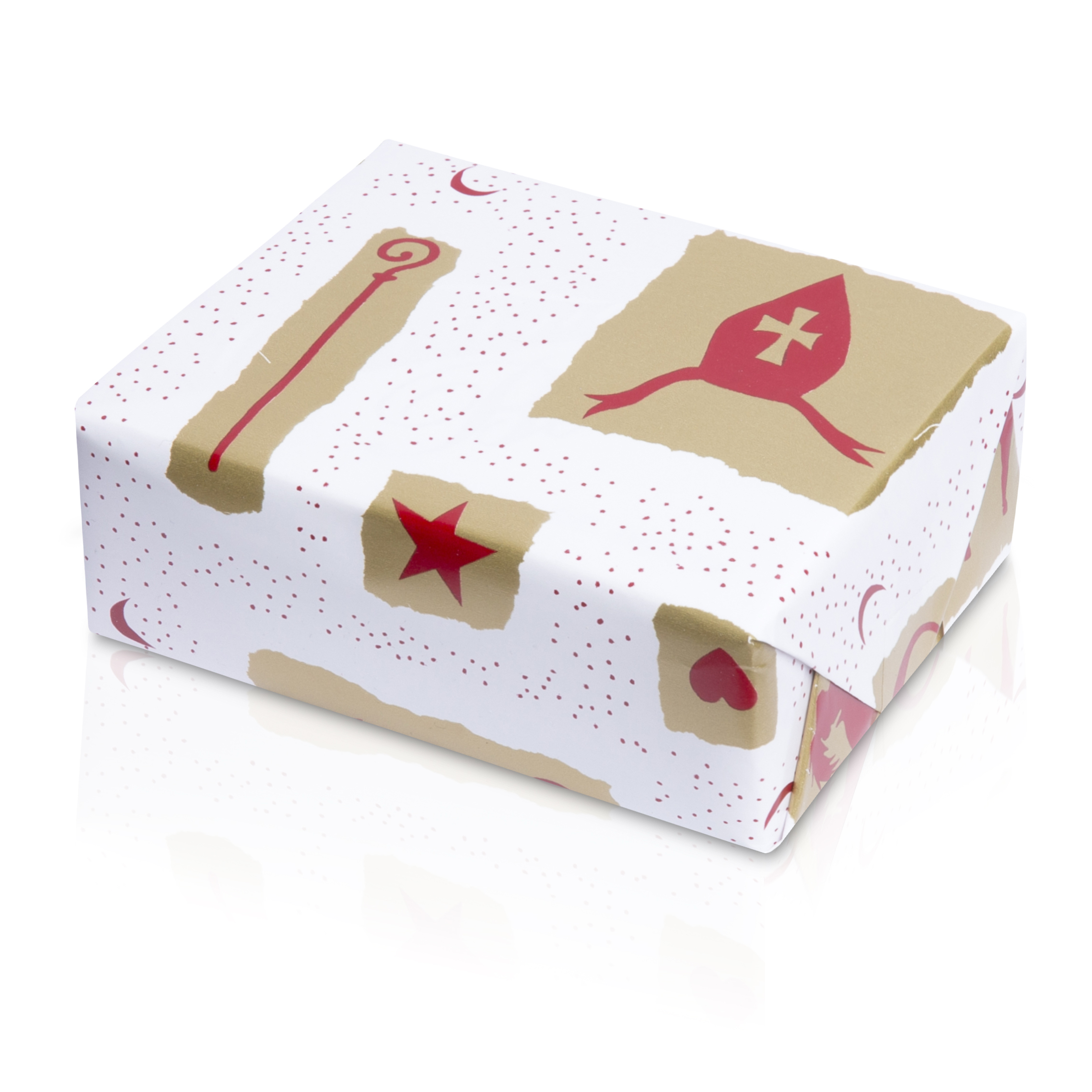 Rood/wit doosje gevuld met een gevarieerd assortiment Sint chocolade. Leverbaar in 250 of 500 gram.